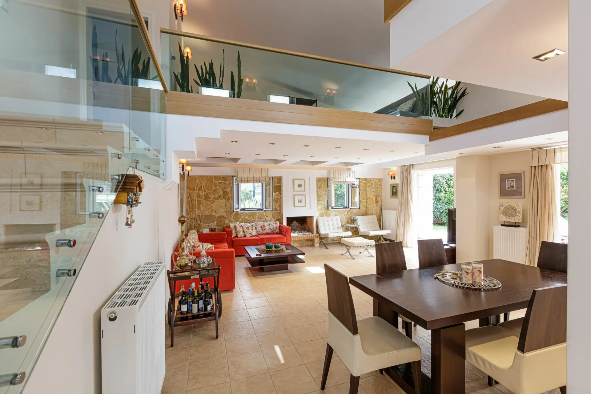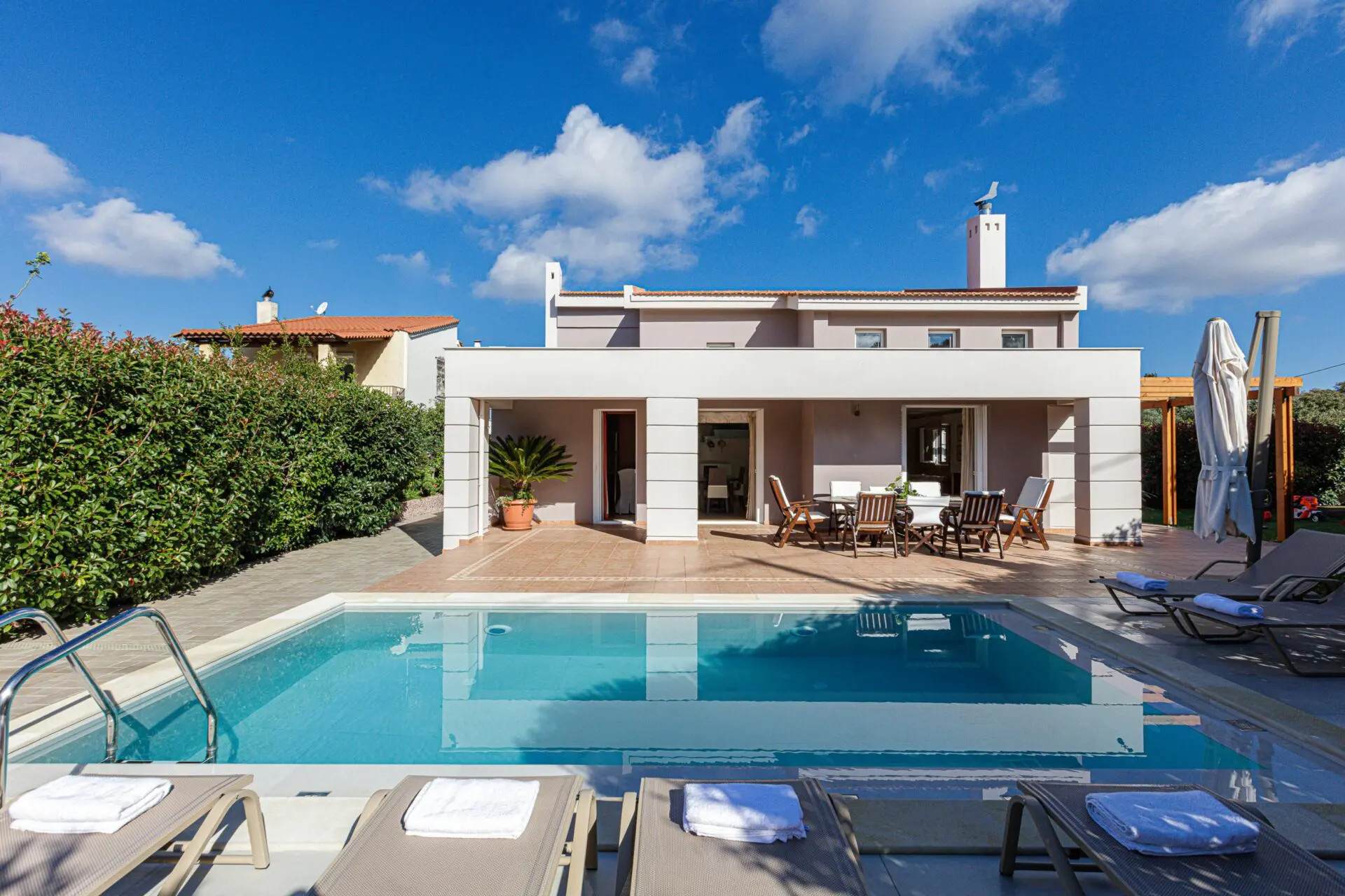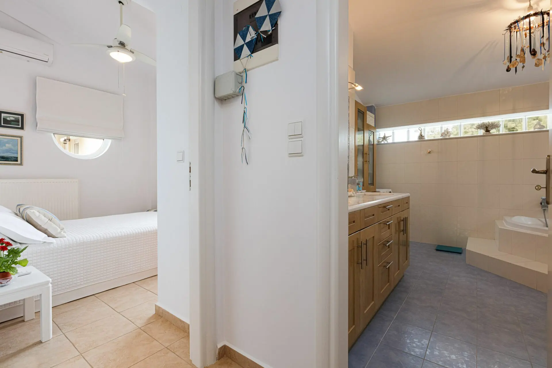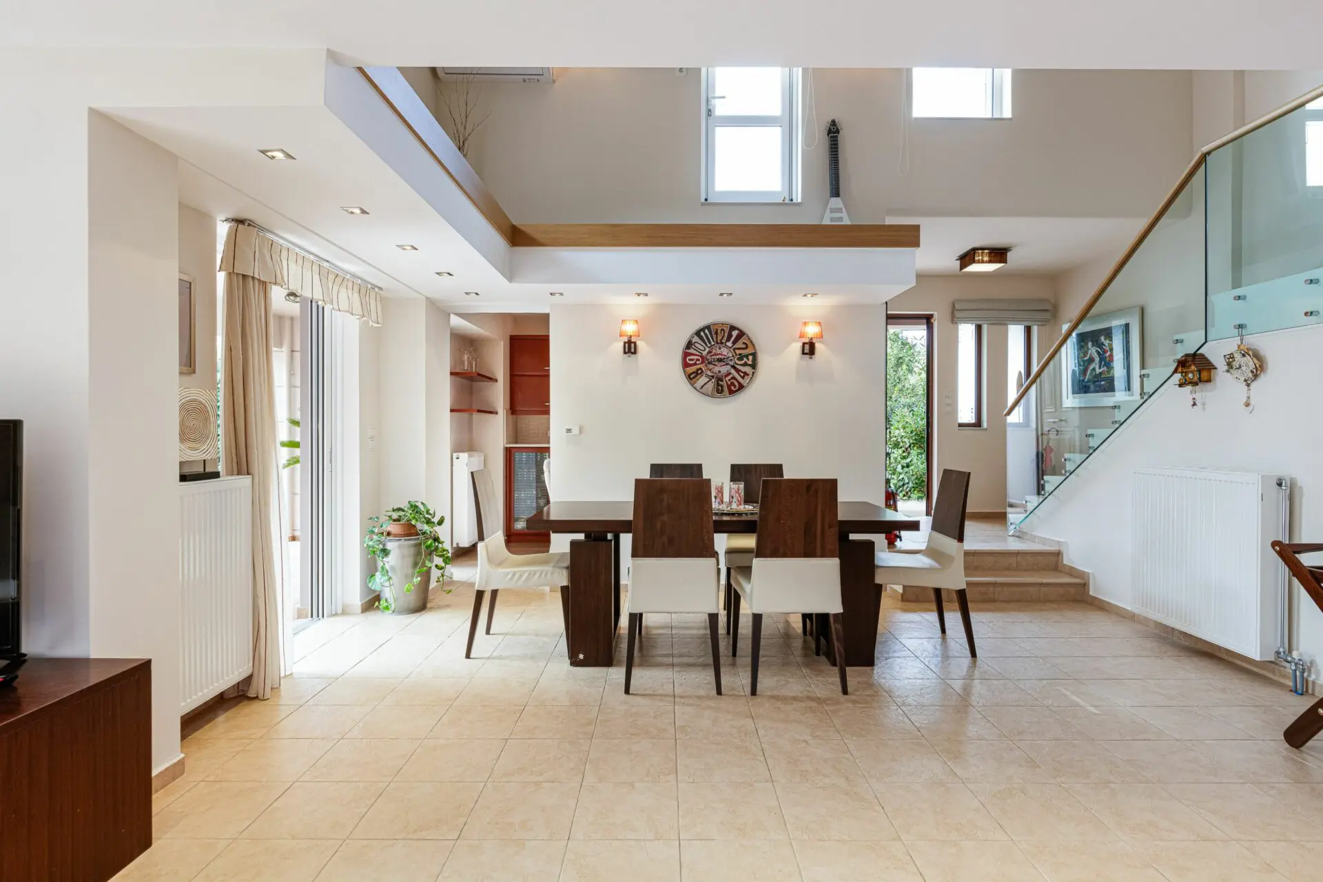 Ideally located in a short distance from some of Crete’s most stunning beaches and landmarks, this 190 sqm villa is set on a 750 sqm plot and spans two floors. The ground floor boasts an open-plan living/dining area and kitchen, with large patio doors leading to the pool terrace. A few steps take you to the open mezzanine floor overlooking the living room and providing an additional seating area. This floor also houses two bedrooms, one with a king-size bed and another with two single beds, both with balcony access overlooking the garden. Additionally, there are two bathrooms on this floor, one with a bathtub and double sinks and the other with a shower.