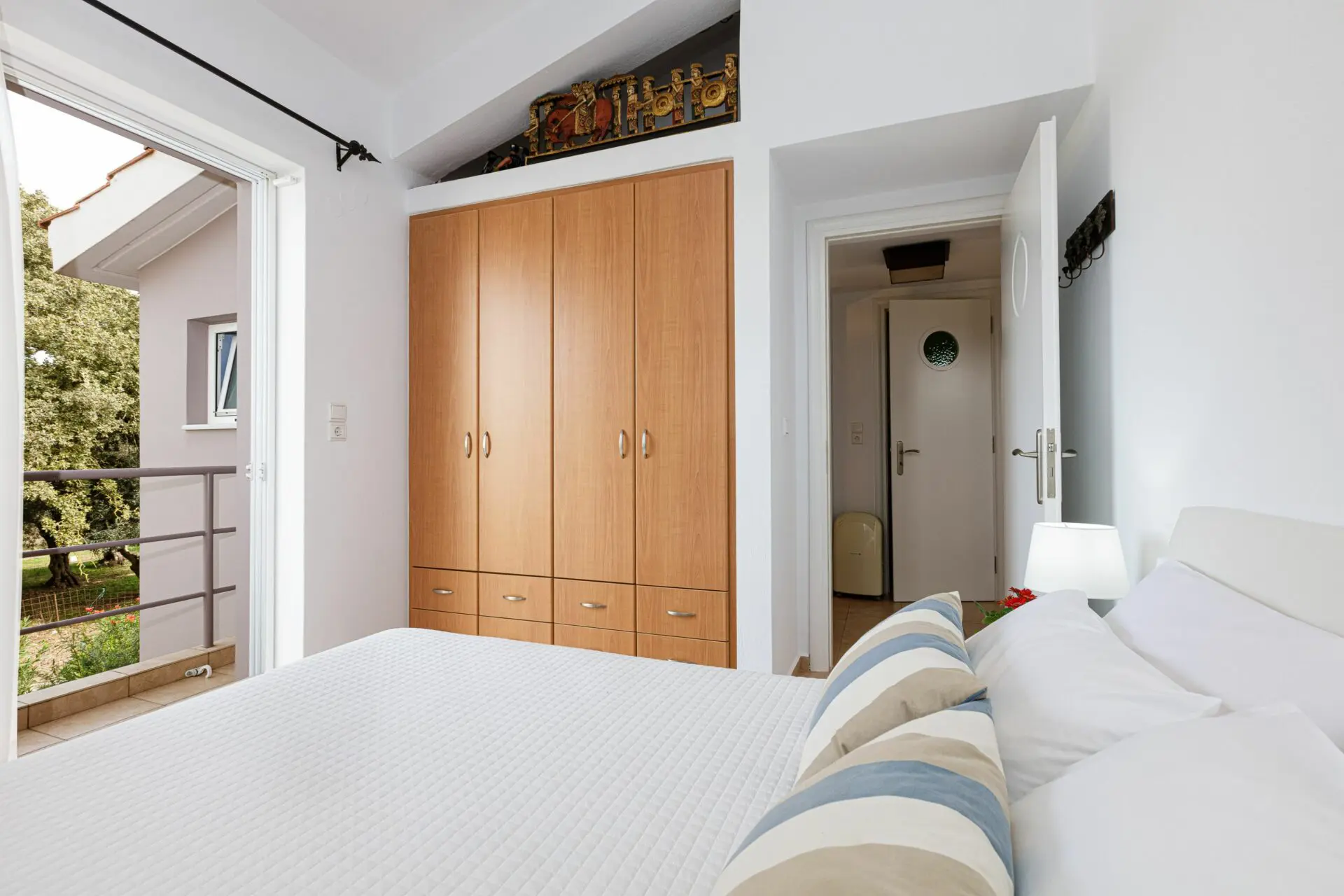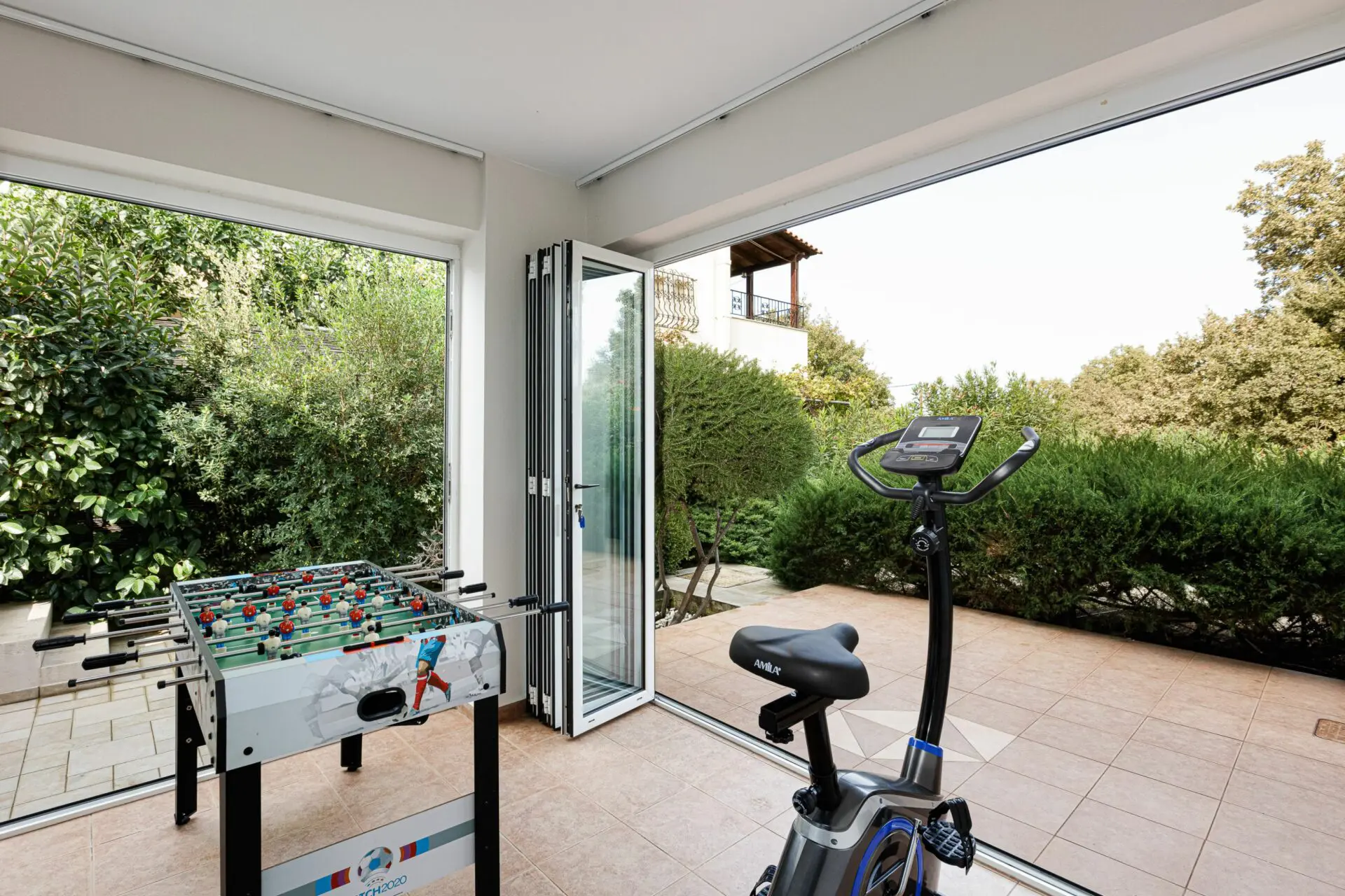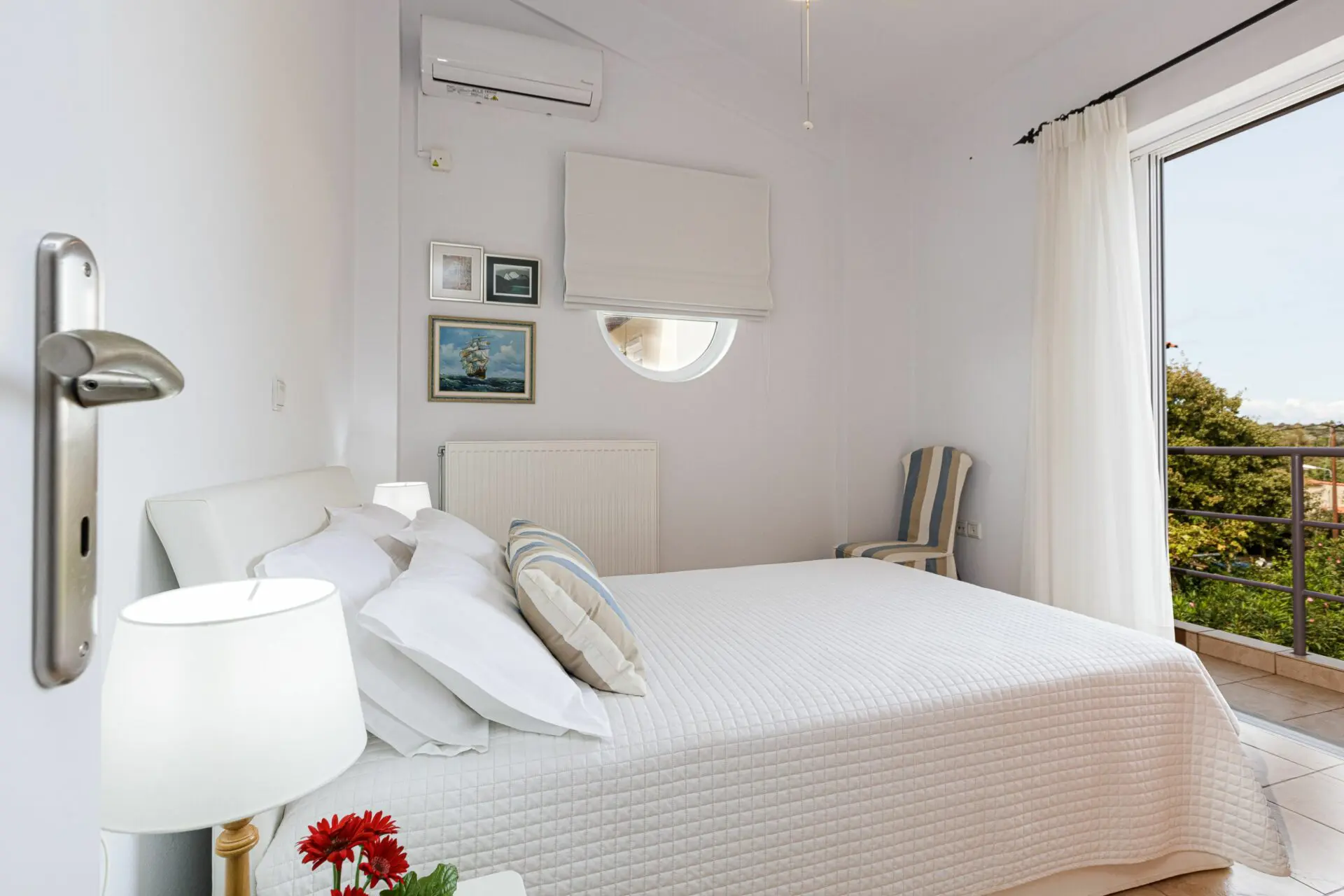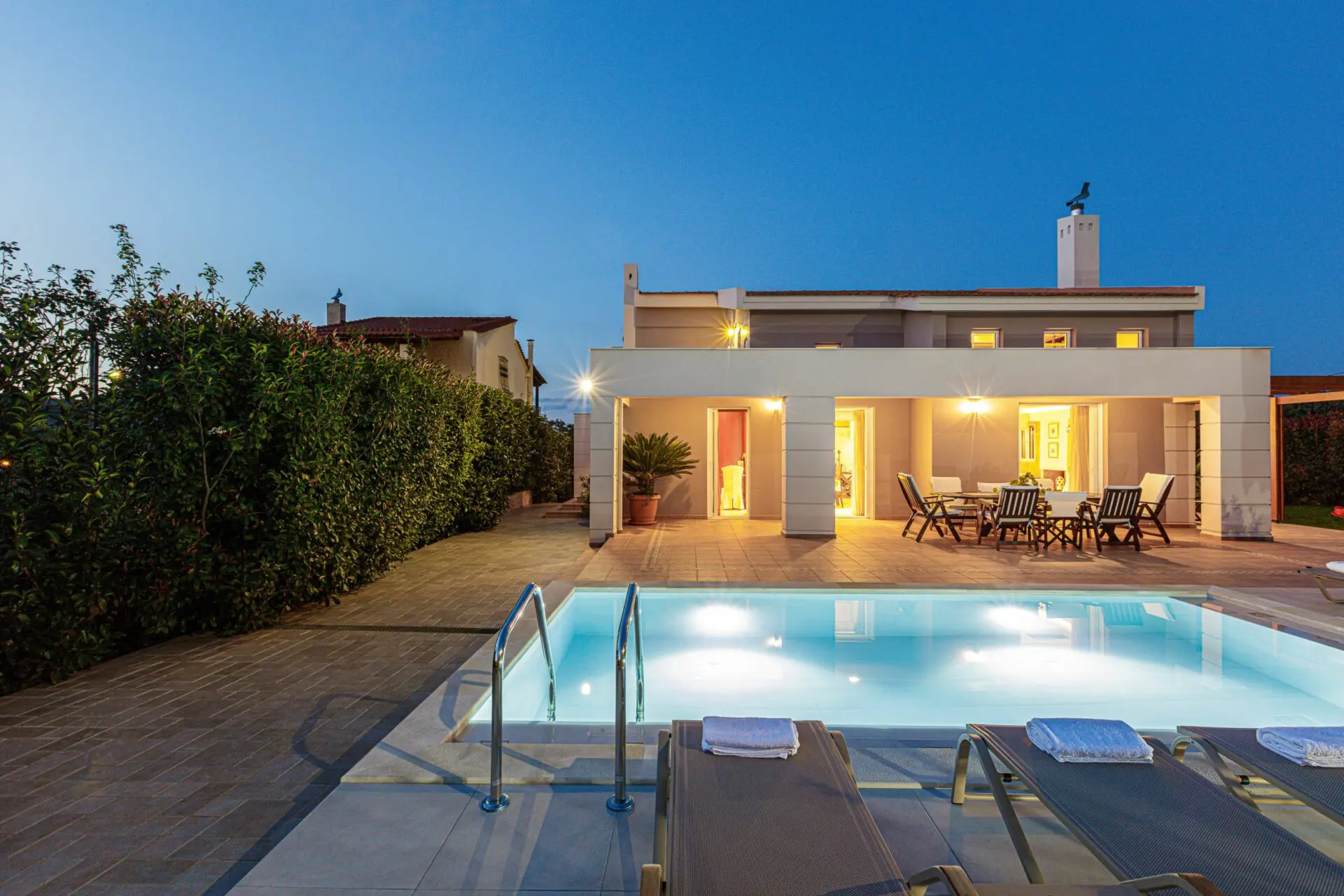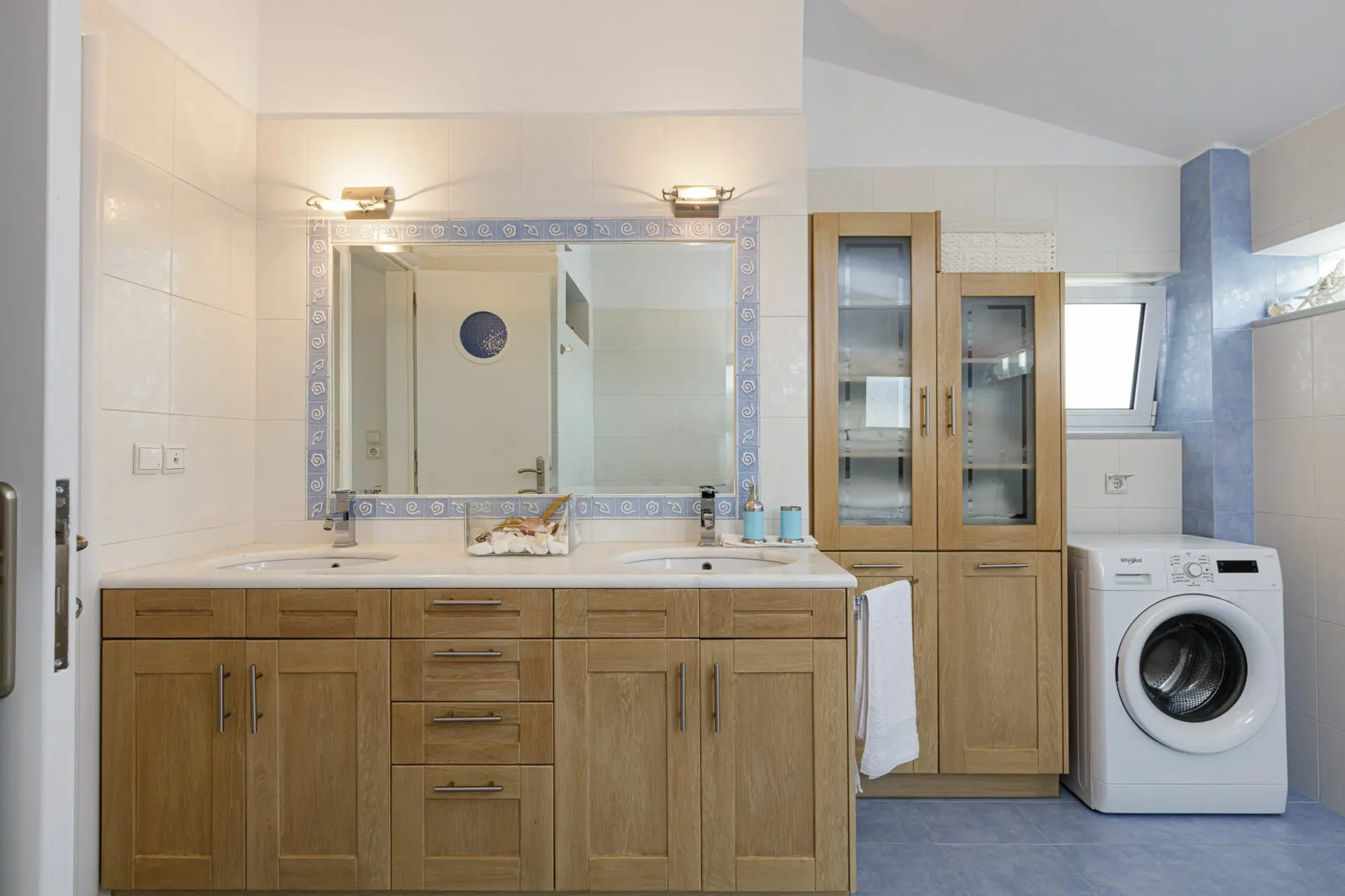 Ideally located in a short distance from some of Crete’s most stunning beaches and landmarks, this 190 sqm villa is set on a 750 sqm plot and spans two floors. The ground floor boasts an open-plan living/dining area and kitchen, with large patio doors leading to the pool terrace. A few steps take you to the open mezzanine floor overlooking the living room and providing an additional seating area. This floor also houses two bedrooms, one with a king-size bed and another with two single beds, both with balcony access overlooking the garden. Additionally, there are two bathrooms on this floor, one with a bathtub and double sinks and the other with a shower.