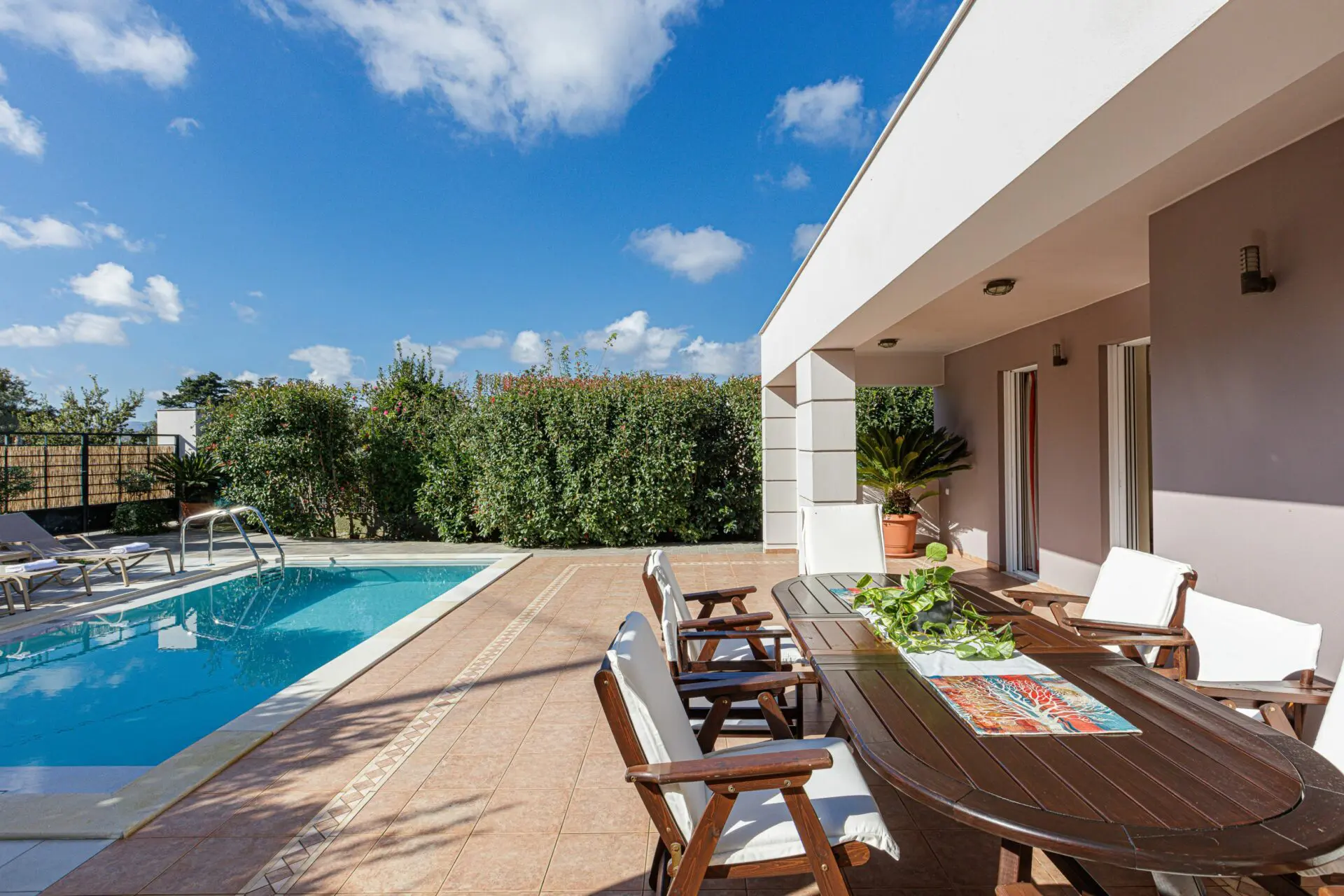 The villa's outdoor area covers 450 sqm and features a 20sqm swimming pool with a sun terrace, sun loungers, umbrellas, and an outdoor shower. There’s also a BBQ, an outdoor dining area with a table for up to ten people, and a shaded pergola with additional seating. The landscaped gardens include various local plants, trees, shrubs, flowers, and lawn areas for children. A gated entrance with a driveway and private parking highlights the villa’s privacy and modern luxury.